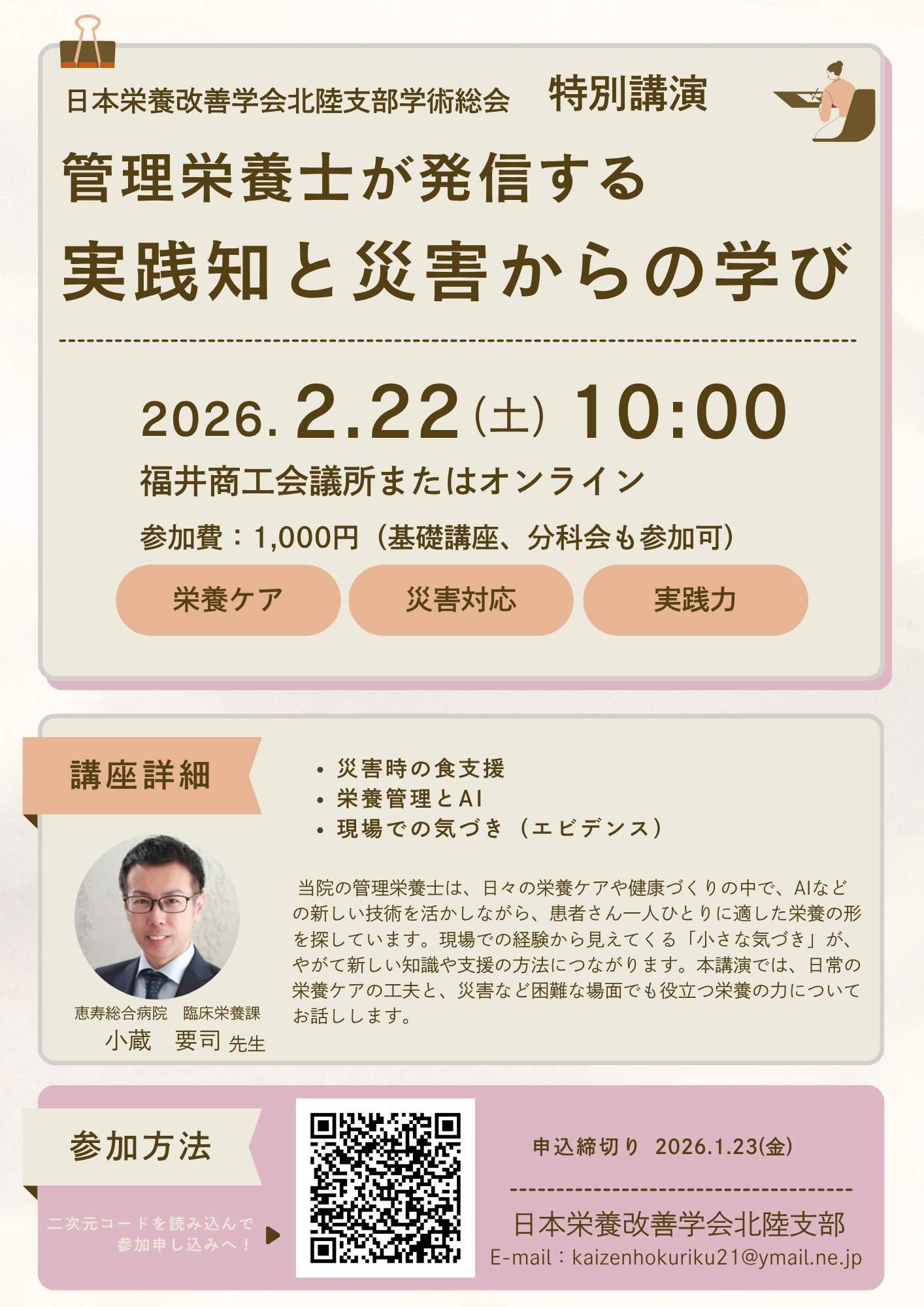 特別講演(市民公開講座)「栄養ケアの最前線~管理栄養士が発信する実践知と災害からの学び~」社会医療法人財団菫仙会 恵寿総合病院臨床栄養課 小蔵要司 氏